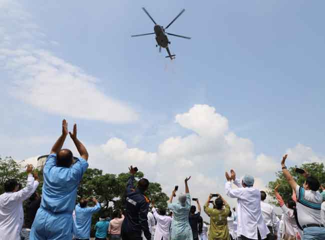 कोरोना वायरस संक्रमण के खिलाफ फ्रंटलाइन वर्कर के रूप में काम कर रहे चिकित्सकों की हौसला अफजाई और स्वागत के लिए भारतीय वायु सेना के हेलीकॉप्टर ने अखिल भारतीय आयुर्विज्ञान संस्थान ऋषिकेश के ऊपर पुष्प वर्षा की। एम्स के चिकित्सकों सुरक्षाकर्मी व अन्य स्टाफ इन यादगार पलों के गवाह बने। इन सभी ने तालियां बजाकर इस पहल का स्वागत किया। एम्स के निदेशक प्रोफेसर रविकांत ने कहा कि कोरोना वायरस संक्रमण के खिलाफ एम्स और उसकी पूरी टीम मजबूती के साथ खड़ी है। हम हर परिस्थिति का सामना करने को तैयार हैं। उन्होंने कहा कि इस महामारी के खिलाफ चिकित्सक पूरे मनोयोग और समर्पण के साथ काम कर रहे हैं। प्रधानमंत्री नरेंद्र मोदी और भारतीय सेना ने निश्चित रूप से यह पहल करके समस्त चिकित्सकों और हेल्थ वर्कर का मनोबल बढ़ाया है।