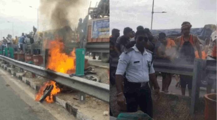 हरिद्वार। गुरुकुल कांगड़ी फ्लाईओवर पर उस समय हड़कंप मच गया जब एक चलती मोटरसाइकिल अचानक आग की लपटों में घिर गई। बाइक में आग लगते ही मौके पर अफरा-तफरी मच गई, लेकिन समय पर पहुंची पुलिस टीम की सतर्कता से एक बड़ा हादसा टल गया।