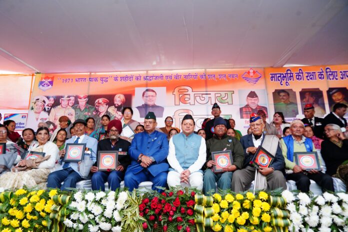 मुख्यमंत्री पुष्कर सिंह धामी ने कहा कि इस युद्ध में पाकिस्तान के लगभग एक लाख सैनिकों ने 16 दिसंबर 1971 को हमारी सेना के समक्ष आत्मसमर्पण किया, जो दुनिया के सैन्य इतिहास में एक अद्वितीय घटना के रूप में दर्ज है। उस युद्ध में लगभग 39 सौ भारतीय सैनिक वीरगति को प्राप्त हुए, जिनमें वीरभूमि उत्तराखंड के 255 बहादुर सपूत भी शामिल थे। तब हमारे प्रदेश के 74 सैनिकों को अपने अदम्य साहस और शौर्य के लिए विभिन्न वीरता पदकों से सम्मानित भी किया गया था।