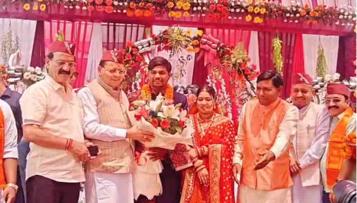 विधायक शक्ति लाल शाह के बेटे की शादी में घनसाली पहुंचे सीएम धामी, वर-वधू को दिया आशीर्वाद