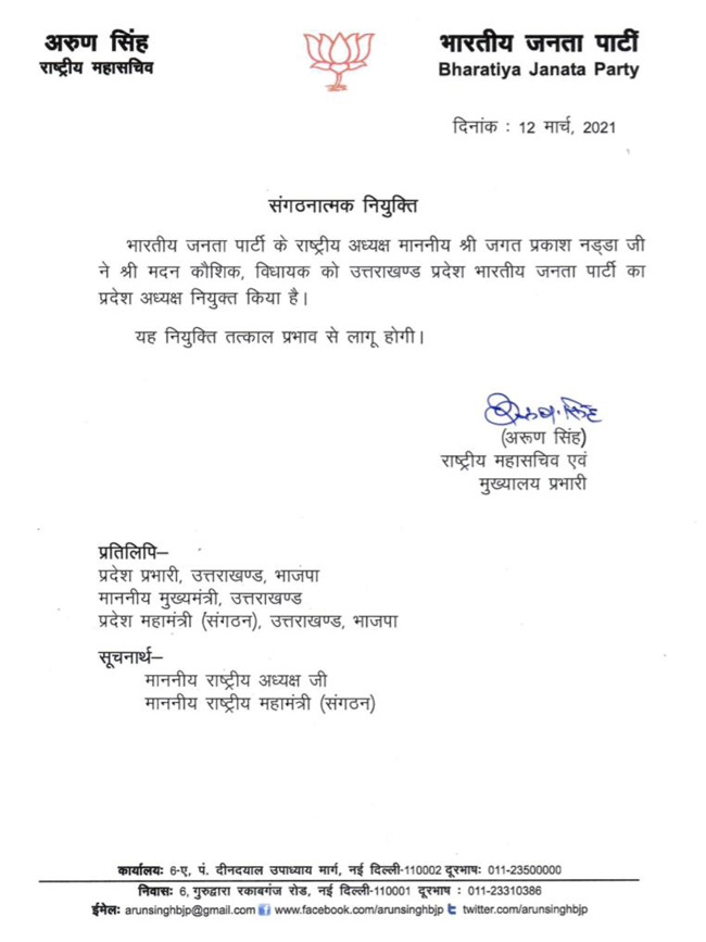 भाजपा हाईकमान ने उत्तराखंड में नेतृत्व परिवर्तन का कदम उठाते हुए त्रिवेंद्र रावत के स्थान पर पौड़ी गढवाल सांसद तीरथ सिंह रावत को मुख्यमंत्री की कुर्सी सौंपी। अब चुनावी वर्ष में पार्टी प्रदेश अध्यक्ष पद पर भी बदलाव कर दिया गया है। त्रिवेंद्र मंत्रिमंडल में शहरी विकास मंत्री मदन कौशिक को प्रदेश संगठन का नया मुखिया बनाया गया है। कौशिक गुरुवार को अचानक दिल्ली पहुंचे थे। दिल्ली में उन्होंने राष्ट्रीय अध्यक्ष जेपी नडडा, राष्ट्रीय महामंत्री बीएल संतोष, प्रदेश प्रभारी दुष्यंत कुमार गौतम समेत कई केंद्रीय नेताओं से भेंट की थी।